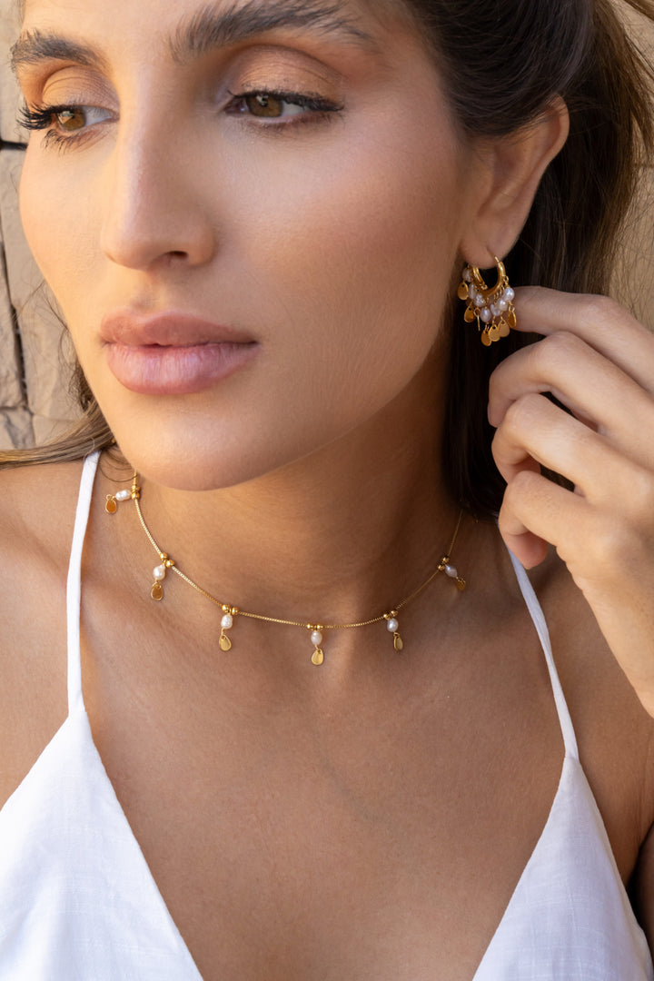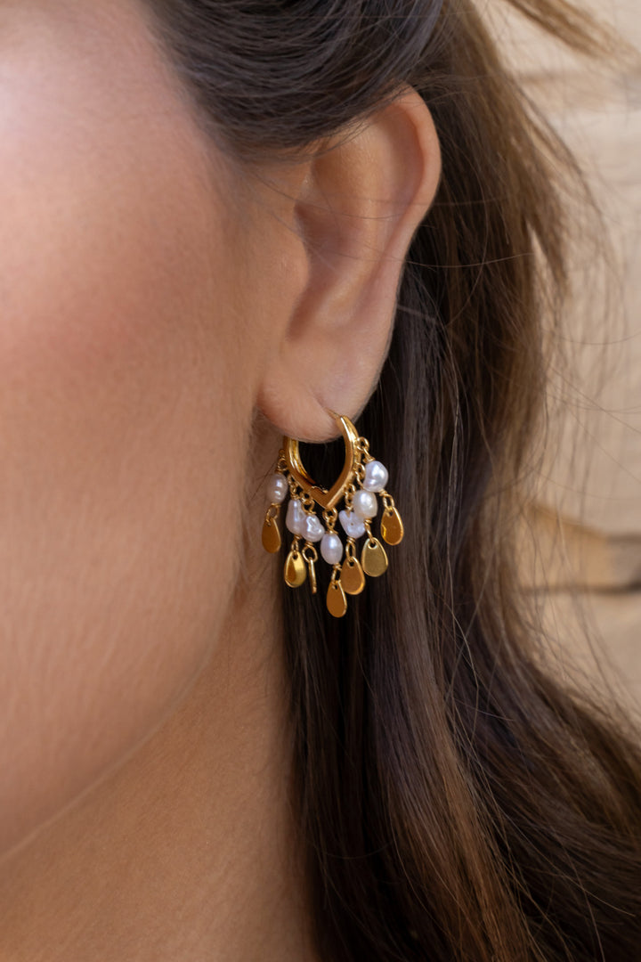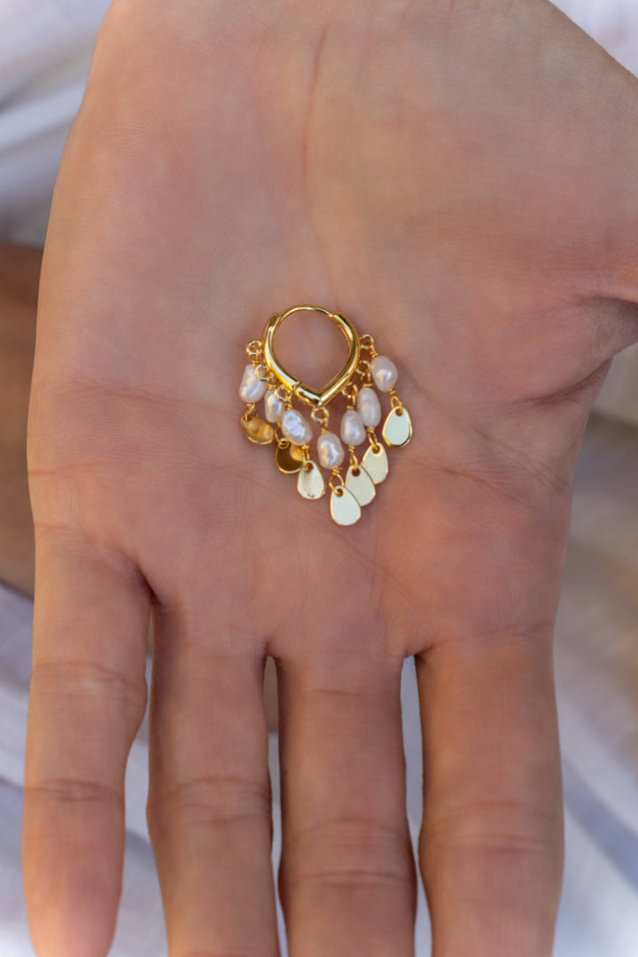 Nosso brinco Ana é composto por uma base de metal em formato V, e possui 7 pérolas e 7 peças em formato de gotas na ponta. É um brinco leve, pesa aproximadamente 2,4gr em cada orelha, banhado à ouro com verniz italiano.