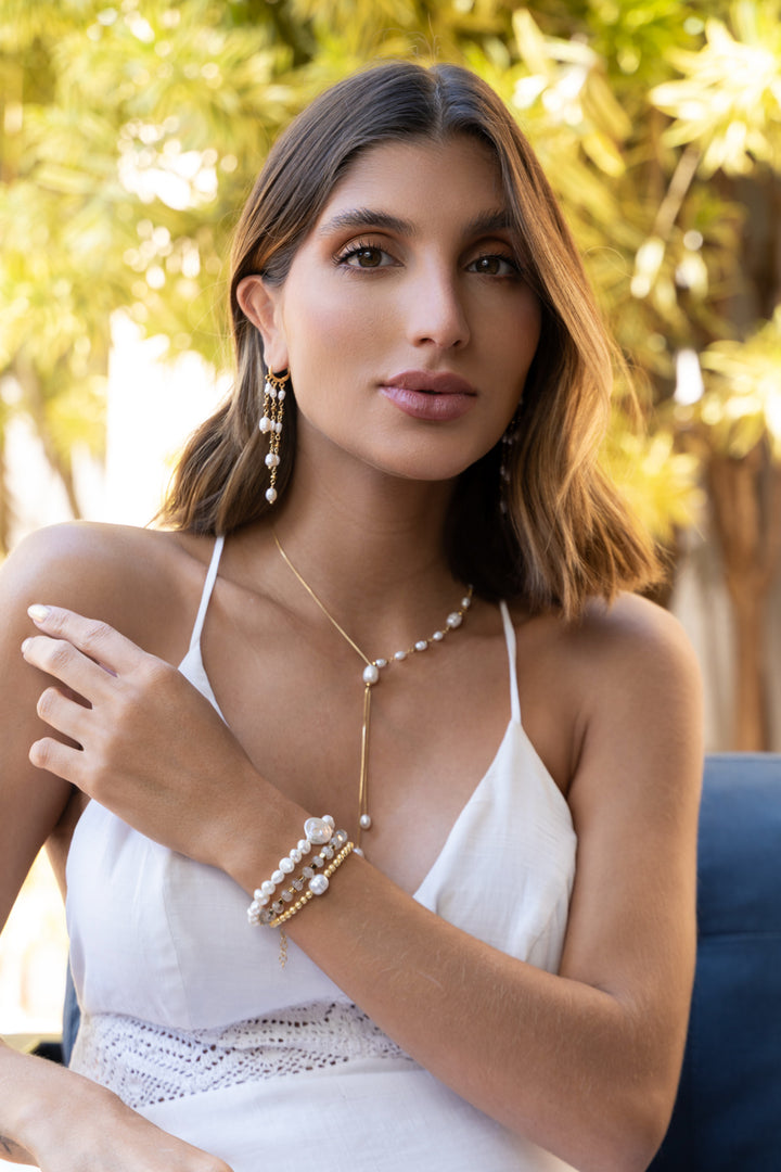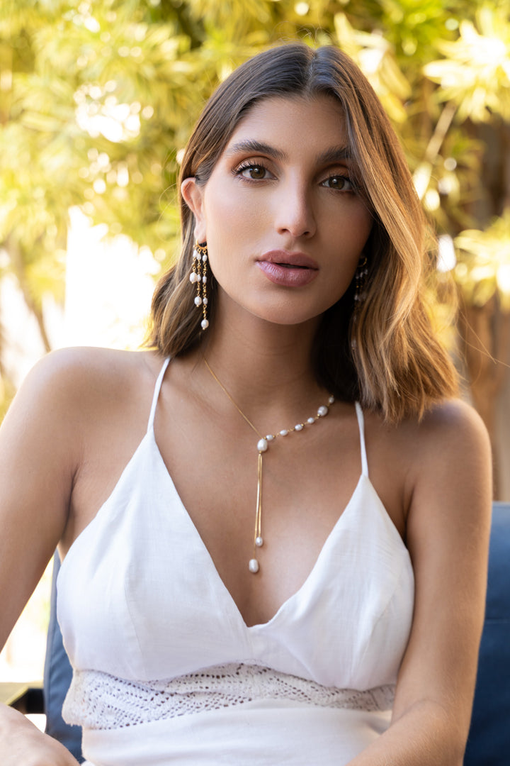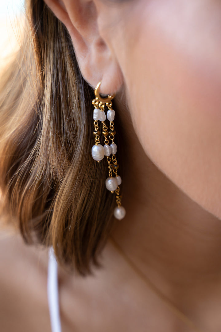 Corrente delicada feita a mão em formato de cascata e pérolas de água doce e Hematitas, pesa cerca de 2,9gr em cada orelha. -Nosso banho é hipoalergênico, contém verniz italiano, não contém níquel e tem 1 ano de garantia.