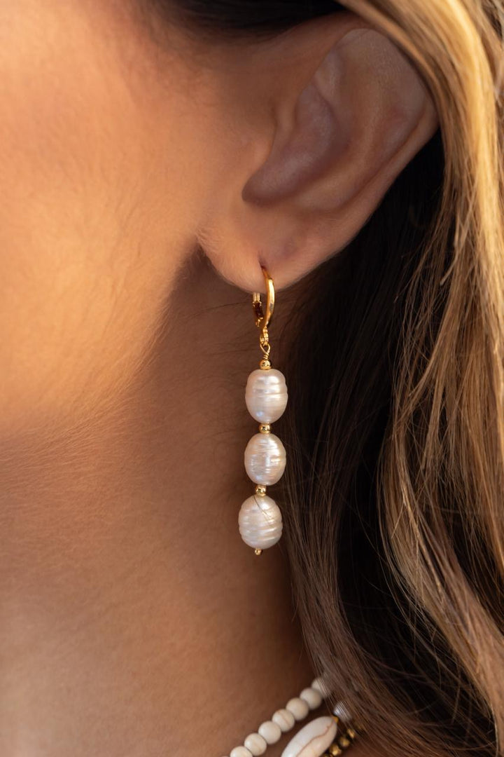 Nosso brinco Maria é composto por uma base de metal redonda, e possui 3 pérolas barrocas. É um brinco leve, pesa aproximadamente 3.5gr em cada orelha, banhado à ouro com verniz italiano. - Nosso banho é hipoalergênico, não contém níquel e tem 1 ano de garantia.