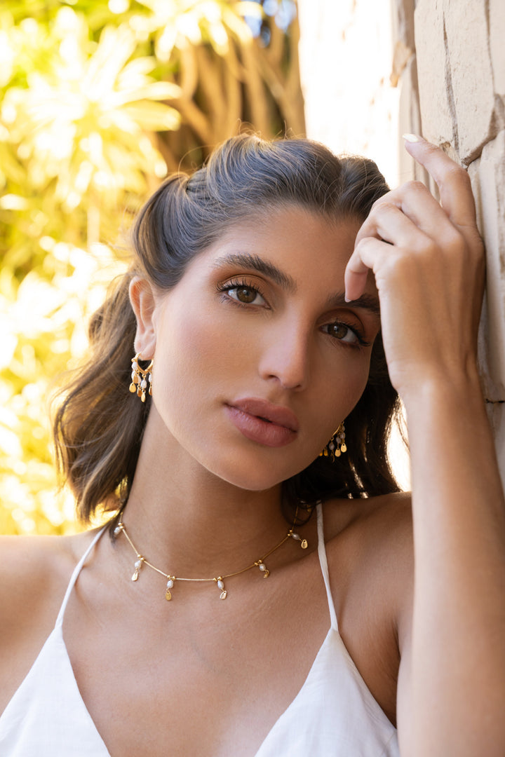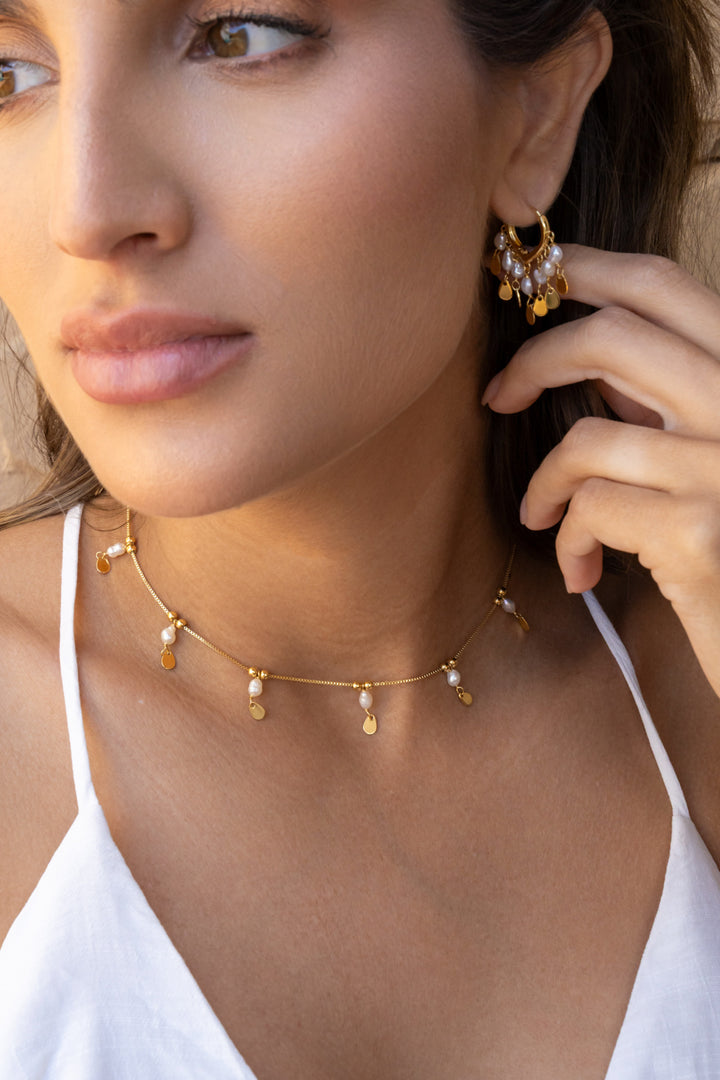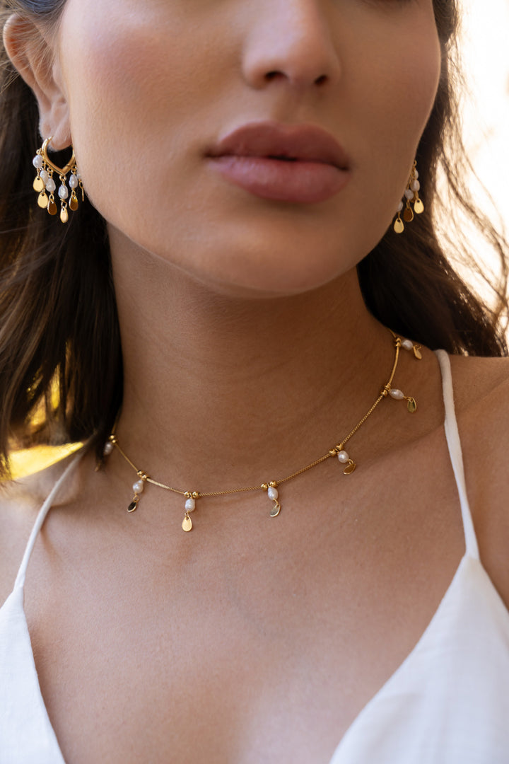 Choker Ana, corrente e madre pérolas no centro contém uma gotinha de metal, possui cerca de 31cm comprimento e 5cm de extensores, o que permite ajustar em qualquer tamanho de pescoço.