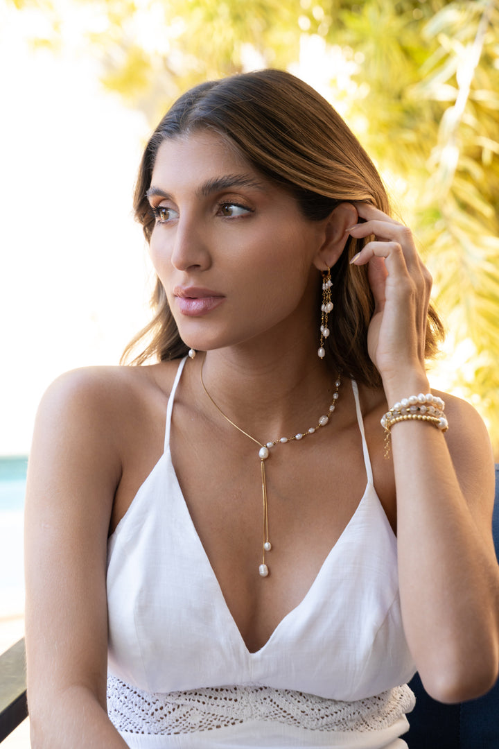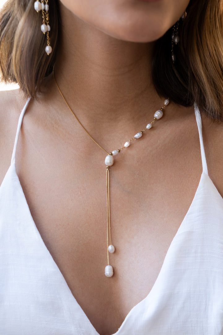 Nosso pêndulo Eunice é composto por corrente delicada feita a mão possui cerca de 31 cm de comprimento, 5 cm de extensores, pérolas e hematitas.