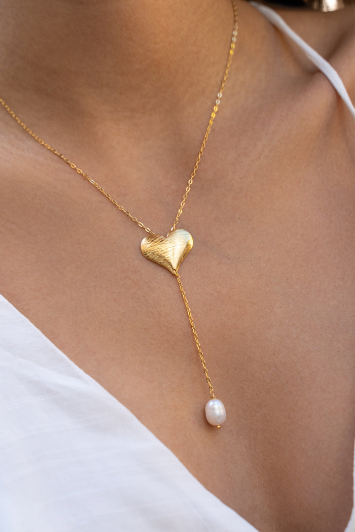 Pêndulo Henny, é composto por corrente delicada, possui cerca de 31 cm de comprimento, 5 cm de extensores e um coração no meio e uma madre pérola na ponta.